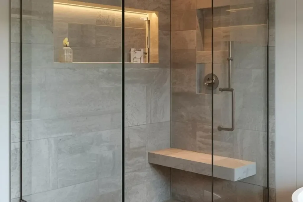 From a design view, a bench can also act as a divider. Placed along the side wall, it keeps water flow controlled without making the space feel closed. Materials matter here too. A bench made with the same tile as the walls blends in, while a stone slab adds contrast and a high-end look.