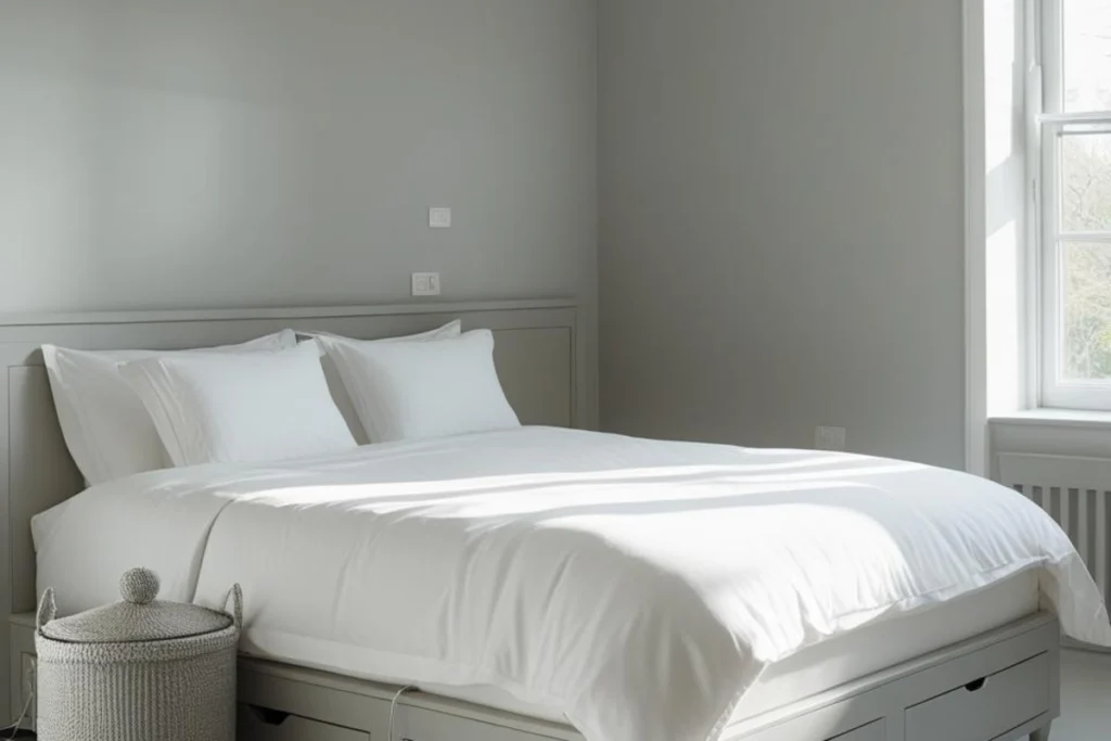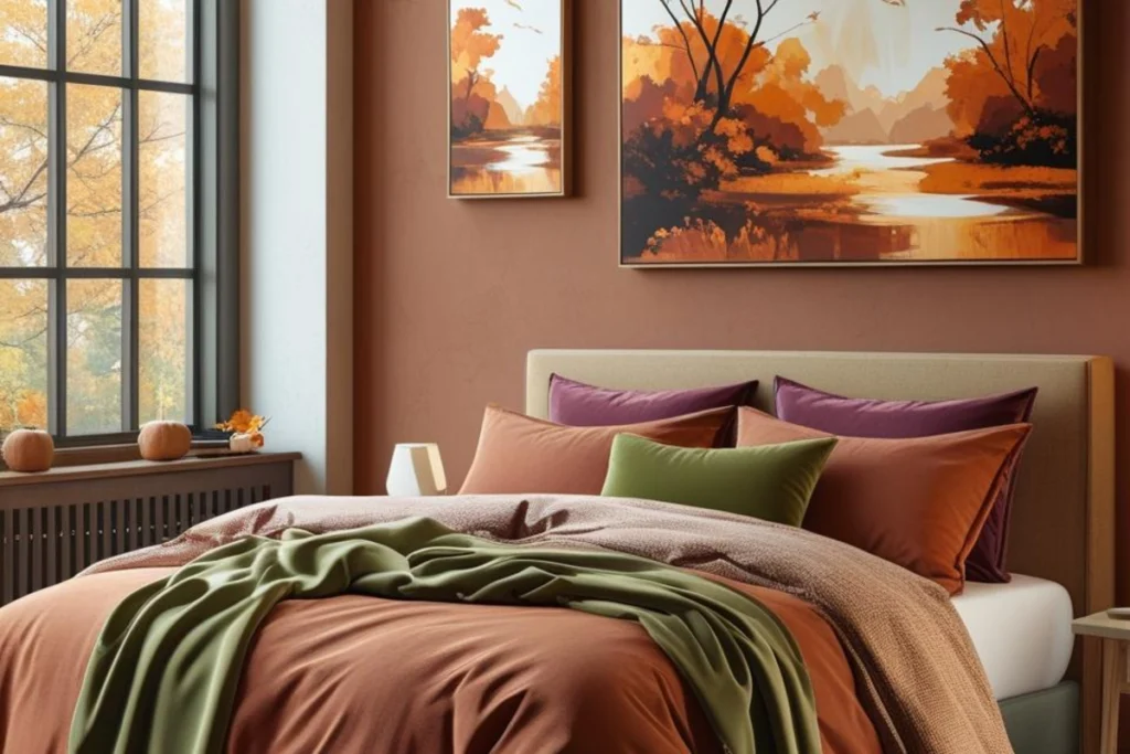 Fall color does not mean heavy or dark. Think warm clay, rust, wheat, olive, and soft plum. Use a single anchor, like a rust duvet or olive blanket, then layer lighter tones around it. This keeps the bed from looking busy. If you want a paint change, choose one wall behind the headboard. A muted earth tone here makes the bed feel grounded. Test a sample on a letter-size sheet, tape it up, and watch it in morning, noon, and night light. Good color should feel steady across the day.