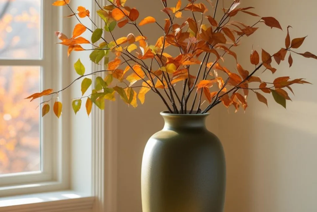 Fresh stems make the room feel alive without adding clutter. In autumn, choose branches with a gentle bend and leaves in copper or olive shades. Place them in a tall, heavy vase so they do not tip. One strong arrangement on the dresser is better than many little bits spread around. If you use faux stems, pick matte leaves with varied tones so they do not look flat. Twist the wires to add a natural curve. Dust weekly so the leaves do not dull the light.