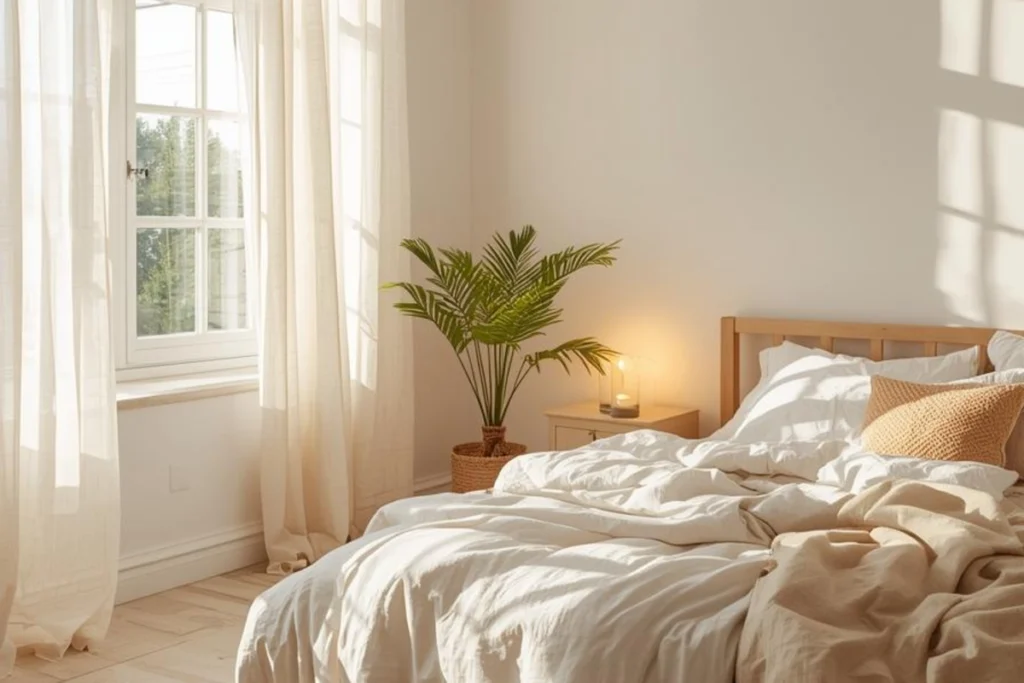 Light defines how a bedroom feels more than furniture ever can. Cozy minimalism relies on natural light as the anchor. Instead of heavy curtains, think of linen drapes or shades that filter but do not block sunlight. This keeps the room bright during the day and softens it as evening approaches.