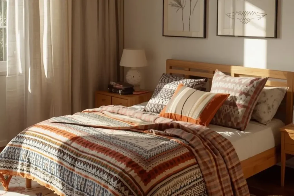 Textiles are the heartbeat of a maximalist boho space. They bring comfort, texture, and color without taking up space. A thick woven blanket, a hand-stitched quilt, and a patterned rug can make a plain room feel full.