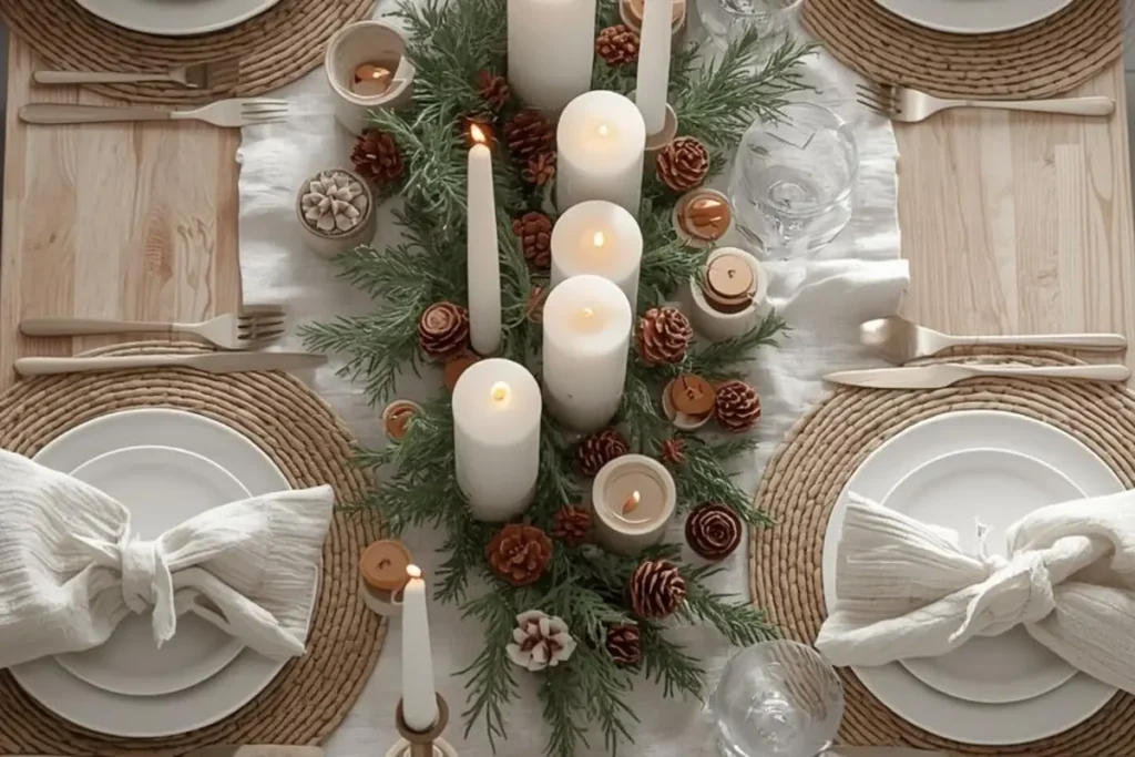 Scandinavian-inspired settings are all about clean lines and cozy touches. A neutral base — whites, beige, and light wood — gives you that open, airy feeling. Add texture with linen napkins, woven placemats, and ceramic dishes. To bring in the Christmas spirit, use natural accents like pinecones, cinnamon sticks, or small sprigs of fir. Candles are key here — lots of them, placed low and close together. The soft flicker of light makes the space feel personal and warm without needing any sparkle.
