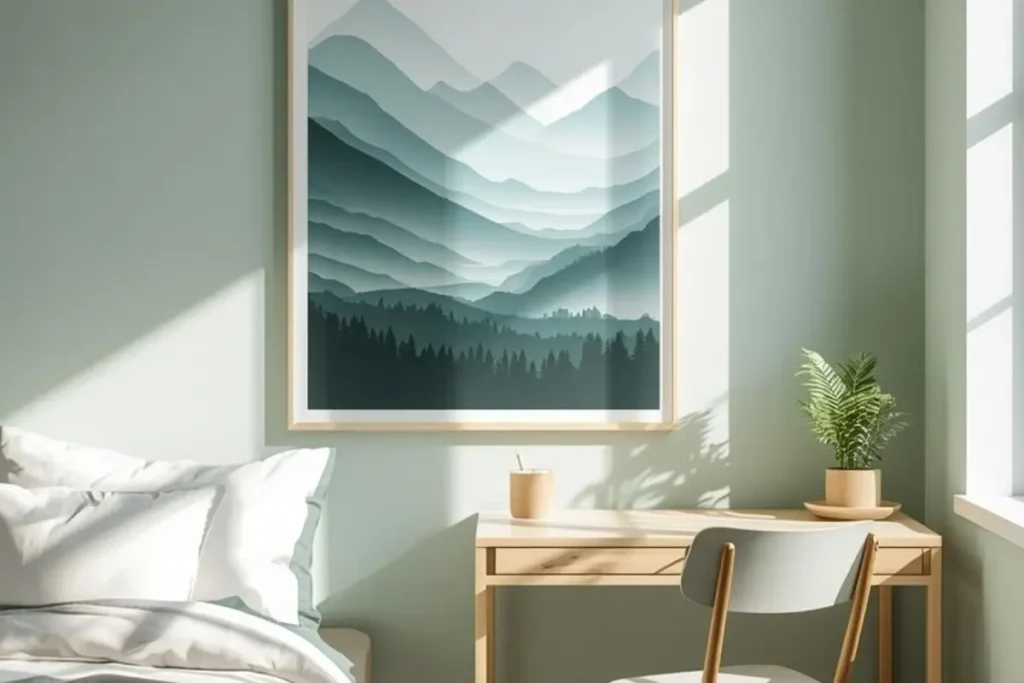 Soft nature tones, like green or blue, naturally make a small room feel less tense. Hang one near your window or above your bed to balance the room’s energy. Even a simple print of leaves or sky can make you feel more connected to the outside world.