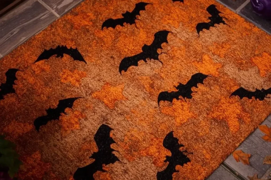 Bats carry movement and energy, which makes them perfect for a doormat design. Painting several flying bats in black across the mat gives the sense of action, almost like they’re swooping across your doorway. They can be placed randomly for a scattered look or in a curved line as though they’re following each other. A deep orange or purple background adds contrast, making the black shapes sharp and eye-catching from a distance.
