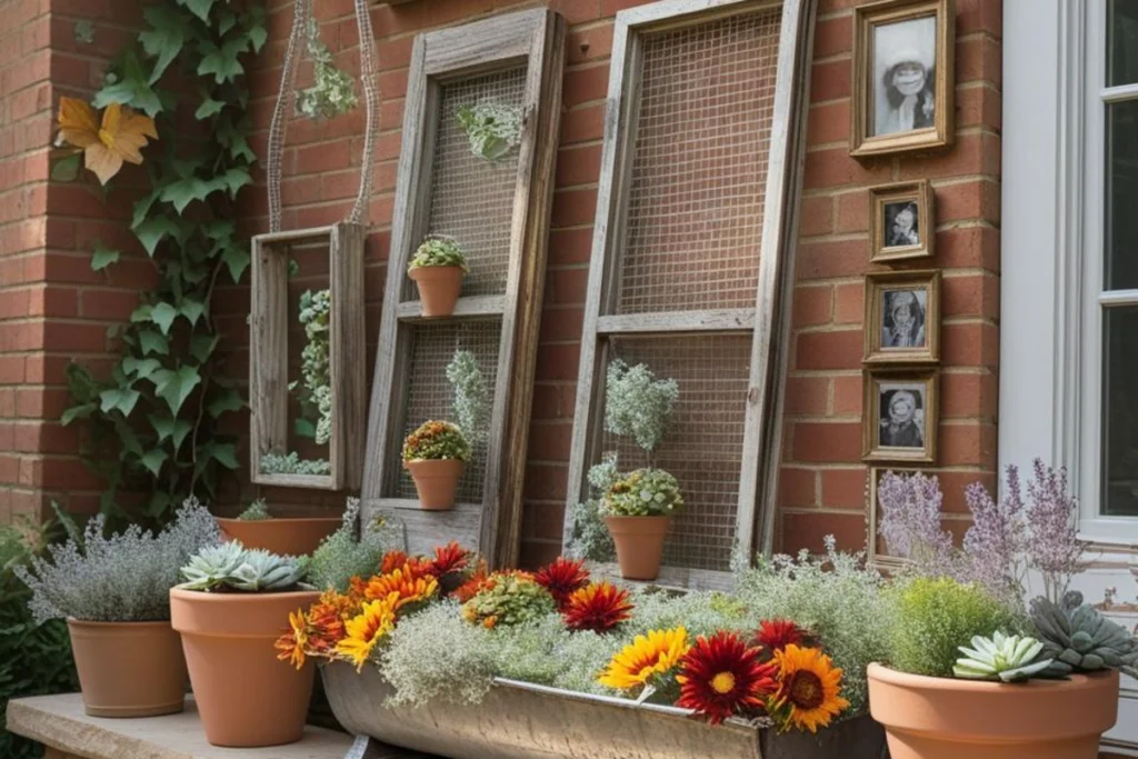 Adding personal touches makes the patio feel like home. A vintage wood sign painted with a simple word like “Welcome” hangs on a wall. Old window frames with wire mesh display small pots, little signs or dried flowers. A weathered trough filled with seasonal blooms shows care. Rustic artwork made from reclaimed wood, metal art or vintage photos in sealed frames become focal points. These pieces connect the patio to your life story. When guests see them they feel invited. They help the patio feel personal, not staged.