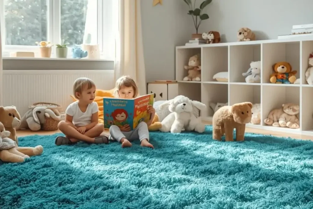 Sometimes the best play happens on a soft surface. A shag rug in bright orange, teal, or hot pink turns the playroom into a cozy retreat. Its thick texture invites sitting, tumbling, and even napping. Unlike flat rugs, a plush option adds comfort and warmth, which is especially helpful on tile or hardwood floors. Kids enjoy the sensory experience of running their hands through the fibers, which can be soothing after active play. A bold-colored shag rug also becomes a statement piece in the room, anchoring the play area without needing much else to decorate.