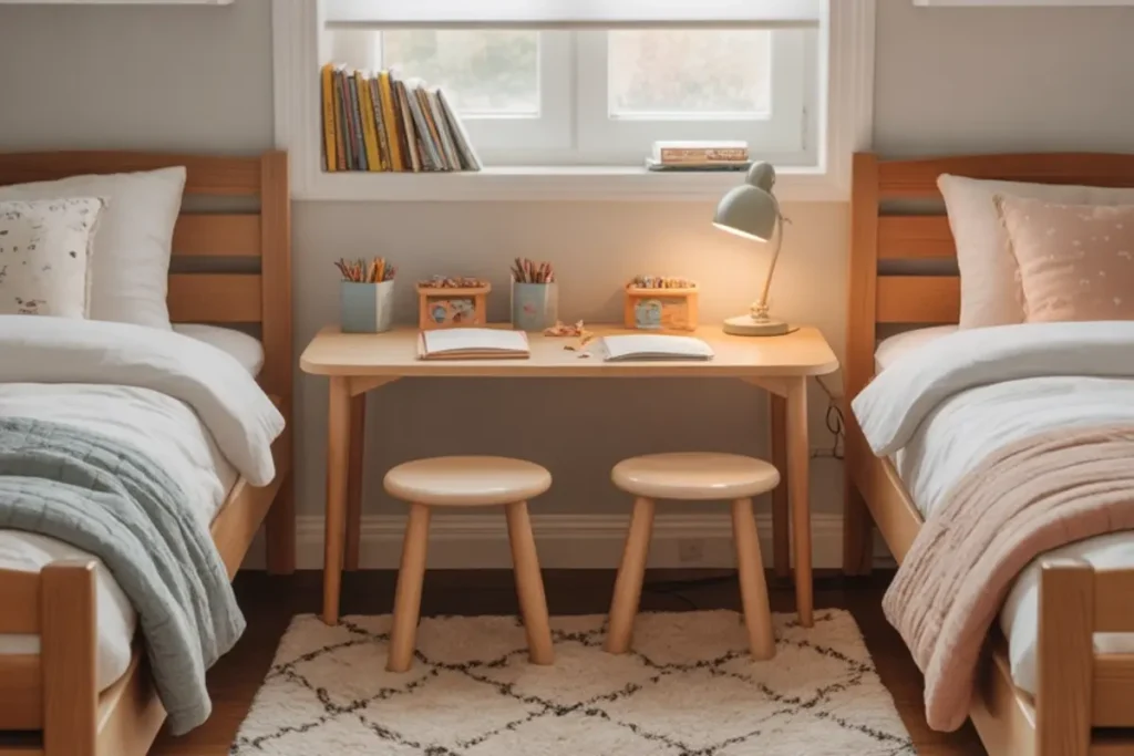 When two kids share a small bedroom, giving them a common spot to play or study encourages cooperation. A compact desk or table in the middle of the room can work for drawing, reading, or schoolwork. You can even slide small stools under it when not in use to keep the space tidy.