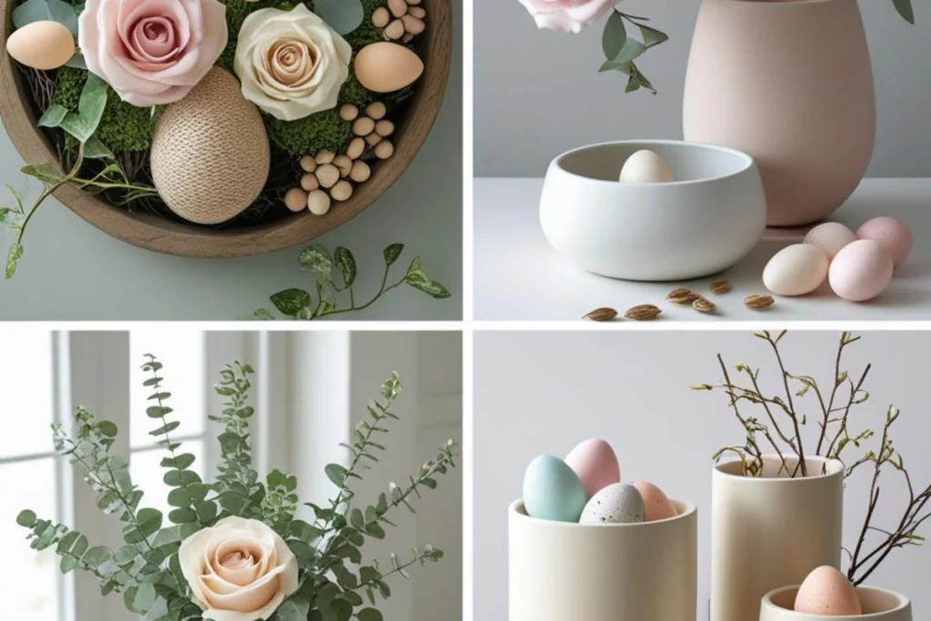 Theme does not need to be loud. A garden theme can be soft with greens, seed pods, and tiny roses. A modern theme can use single-color palettes, clean containers, and few accents. A farmhouse theme uses wood, simple ceramics, and nests or eggs. Choose one word to guide the table, like “light,” “garden,” or “gather,” and let that word guide your picks. This keeps the table coherent and calm, which is the secret of a strong design.