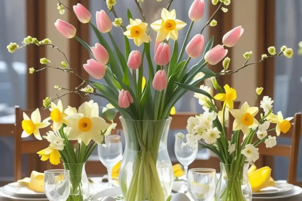 Not all flowers hold up the same. Tulips, ranunculus, daffodils, and spray roses read like Easter. Lilies make a bold statement but can be strong in scent, so avoid them if some guests are sensitive. Choose blooms with sturdy stems if the table will be bumped often. Use flowers with different shapes: round blooms give softness, spiky blooms add lift, and small filler flowers knit the look together. Think about color too. A soft palette of blush, cream, and light green feels calm. Bright pastels give a cheerful look. Use one strong color and a couple of softer tones to keep the table balanced.