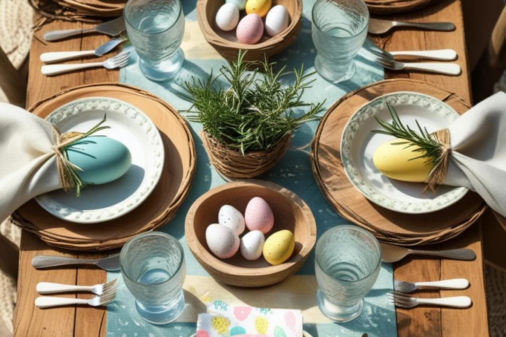 Place settings should welcome guests and be easy to clear. Start with a simple charger or a placemat in natural wood or woven straw for texture and warmth. Fold cloth napkins into a soft envelope shape and tuck a small sprig of rosemary or lavender inside so each guest gets a little scent. For a low-cost option, use paper napkins with a pretty pattern and tie them with twine and a tiny tag with the guest’s name. Use mismatched vintage plates for a collected, homey look; the shapes and colors will add visual richness without extra work. Place small ceramic eggs at each setting as a keepsake or treat; choose one color to keep the table calm. Wrap utensils in a napkin and place them in a shallow bowl so the table stays tidy and shorter on cleanup. Use small wooden boards as plate toppers for a modern rustic touch that doubles as a cutting board for bread or cheese later. If you want light formality, add a simple glass charger under the plate and keep the center of the table low. Use pastel-toned tumblers for water and clear glass for wine so the table feels fresh. For kids, set a small paper placemat with a simple color activity or a sticker placed beside their plate so they have one more happy thing to do while waiting.
