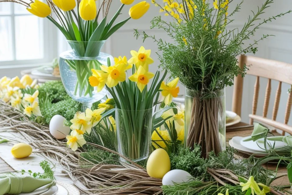 Choose flowers and branches that hold up through the meal. Tulips are classic but can droop; cut stems short and set them in cool water to keep them perky. Daffodils pair well with mixed greens and make a bright, cheery cluster. Forsythia branches bloom early and add height for little work. Use potted herbs like mint, thyme, or rosemary as both a visual and a scent element; guests can pinch leaves for food. Pussy willow branches offer structure and a soft feel; place a few stems in tall narrow vases. Mix silk stems with real ones if you need more staying power; tuck the silk into the base so it looks natural. Wild grasses and seed heads add texture and last a long time if you want a dried look. Finally, place a few clippings of fresh greenery from the yard along the runner for a simple and long-lasting ground layer.