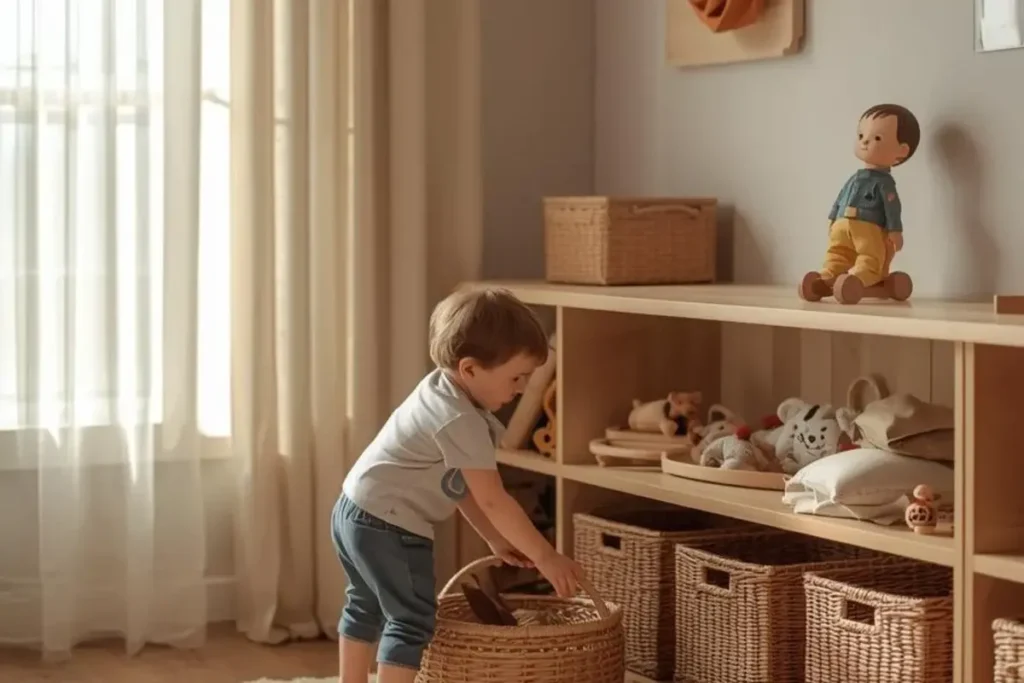 In Waldorf playrooms, toys are stored in baskets, open shelves, or low cabinets. This makes it easy for children to see what they have and to clean up without stress. Too much hidden storage can overwhelm, while open but ordered storage teaches children responsibility.